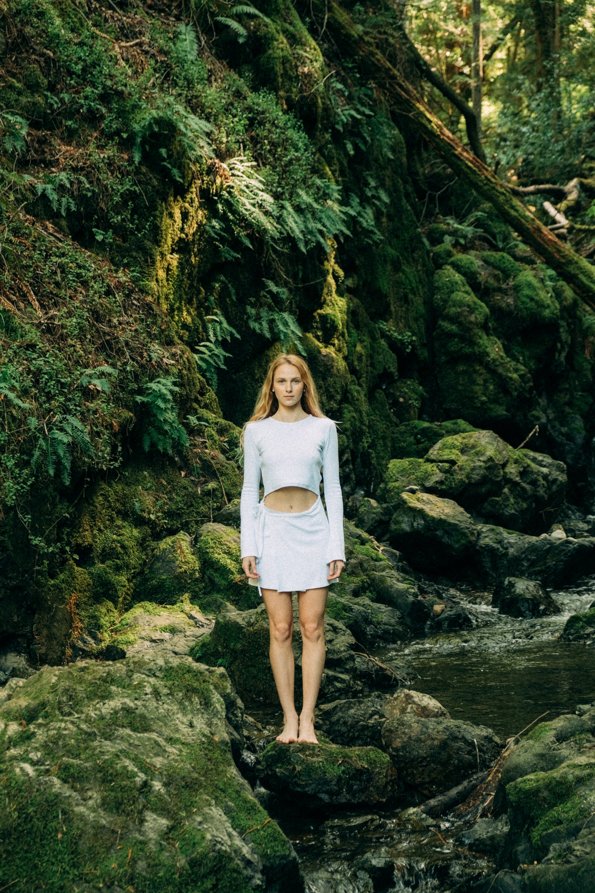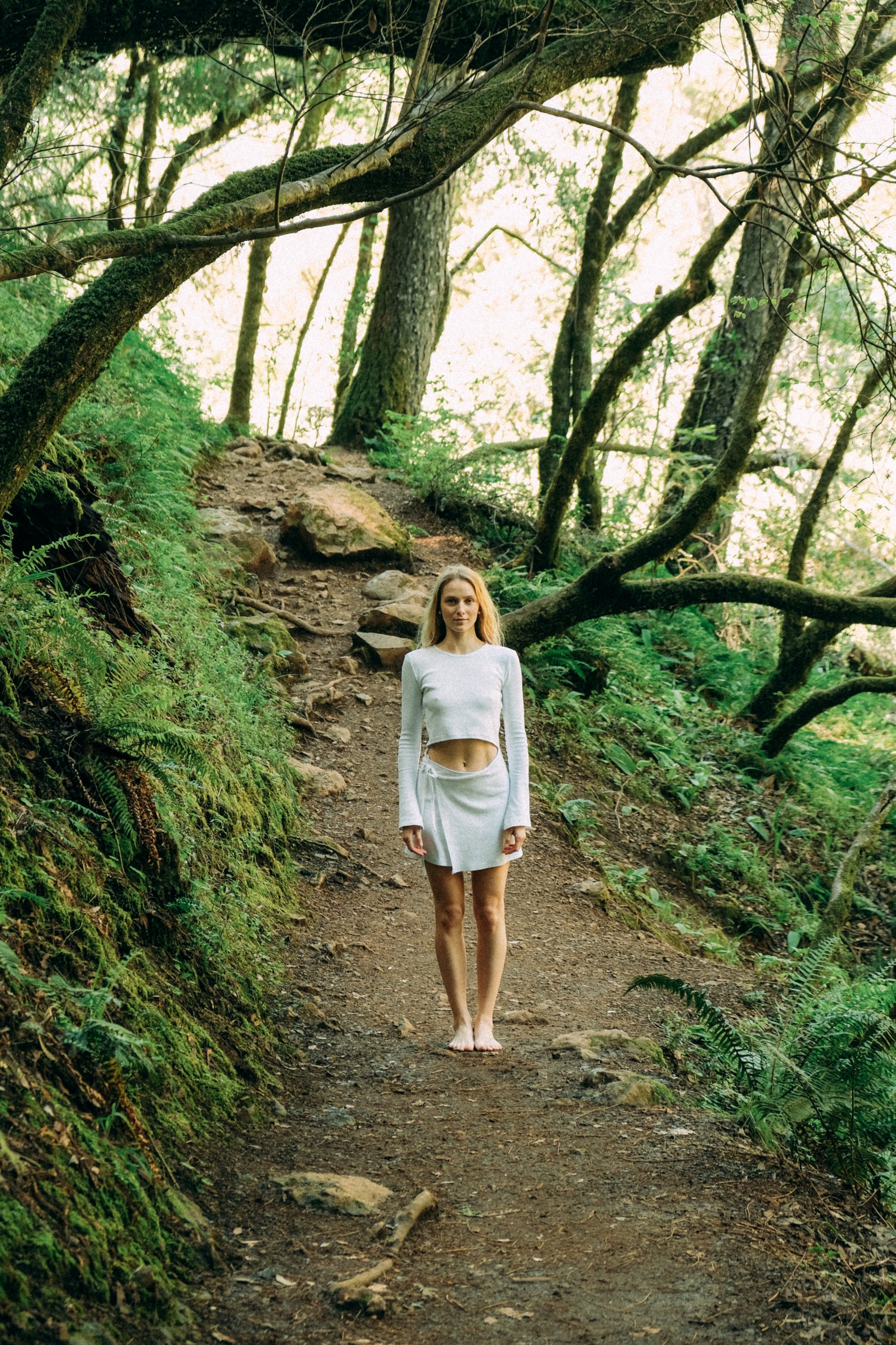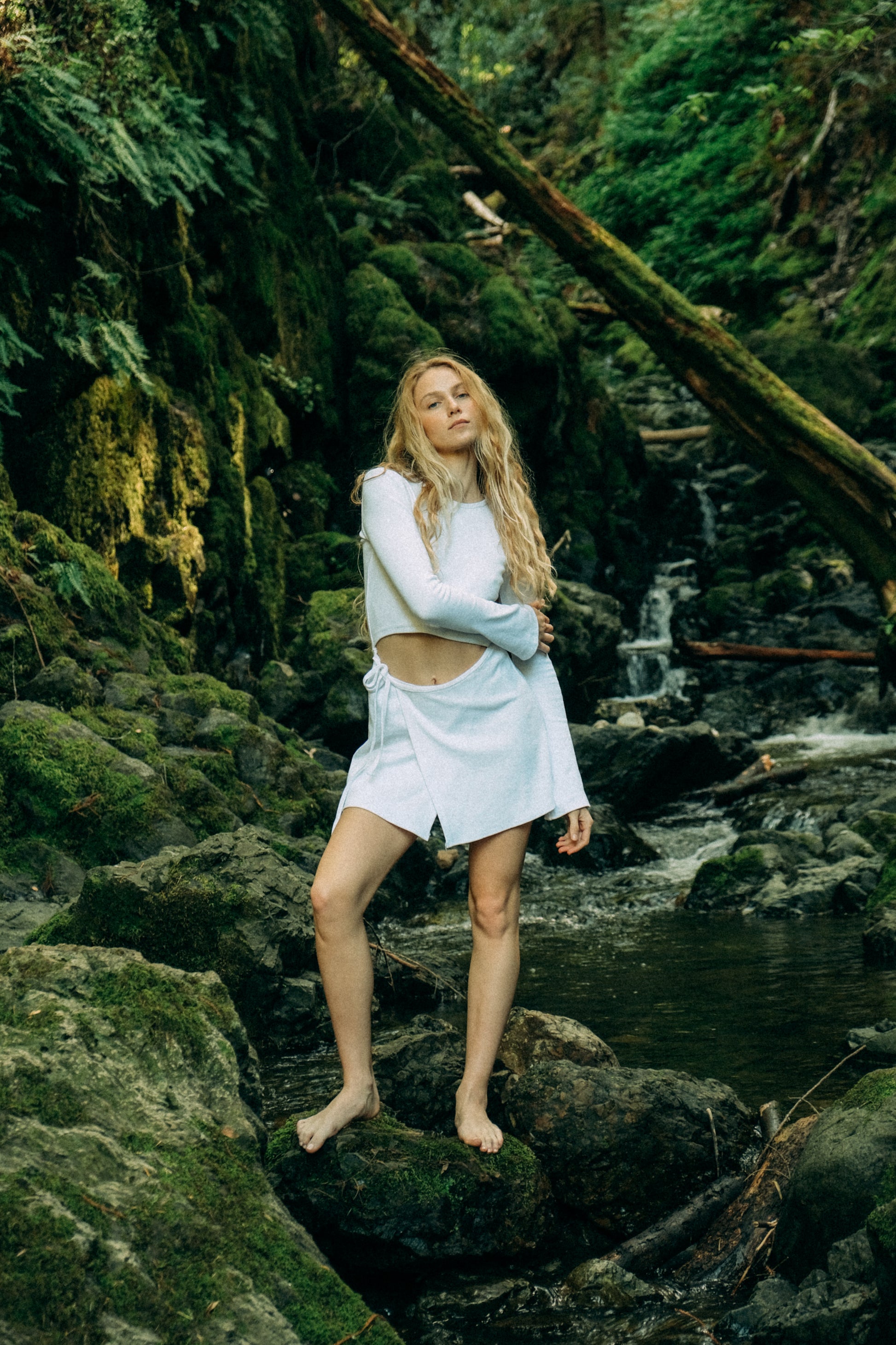 A wrap skirt merges seamlessly with a long-sleeved top, forming one fluid silhouette. A delicate cut-out at the waist reveals a subtle glimpse of the bellybutton — an interplay of restraint and allure that feels both effortless and striking.