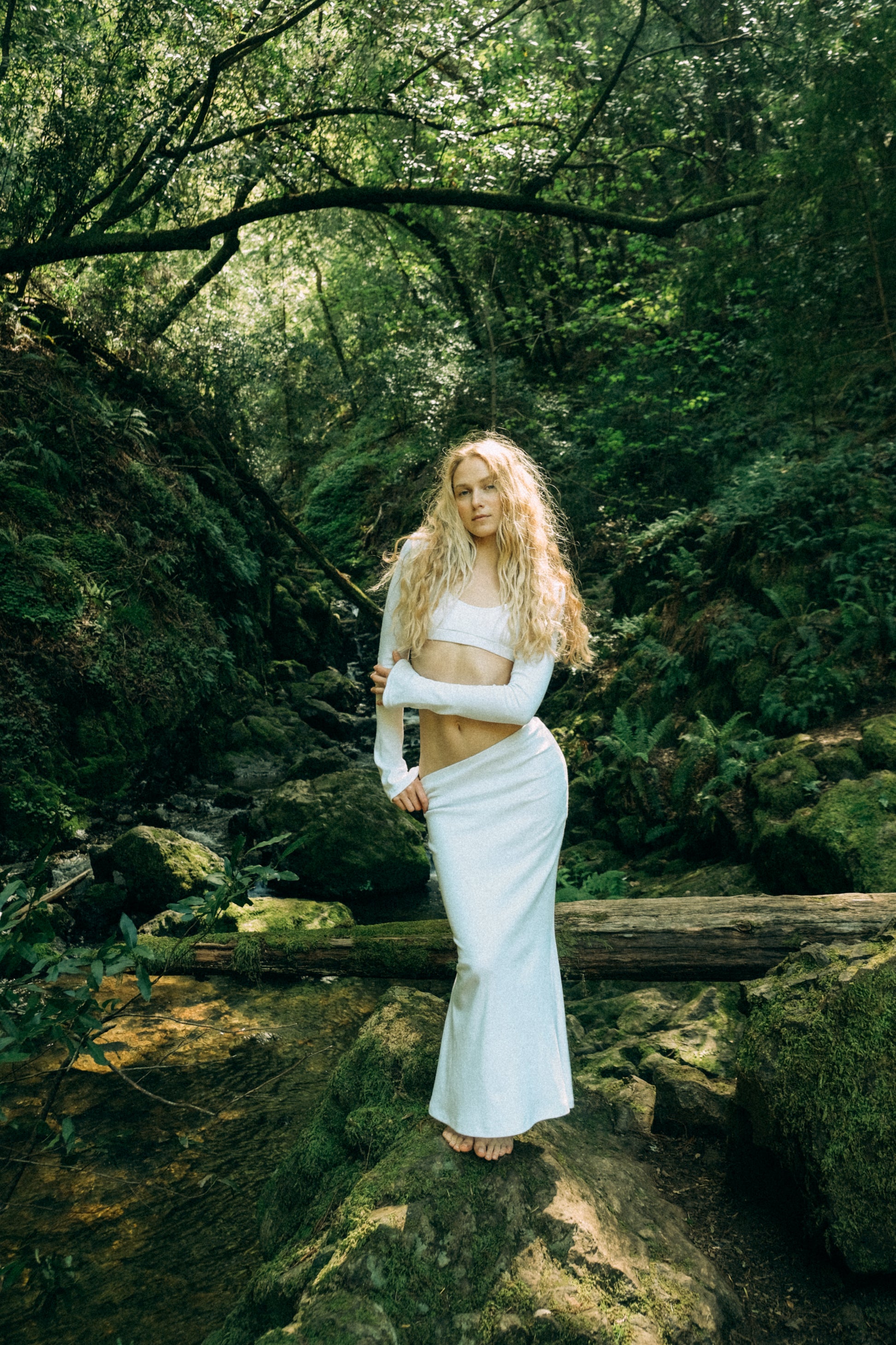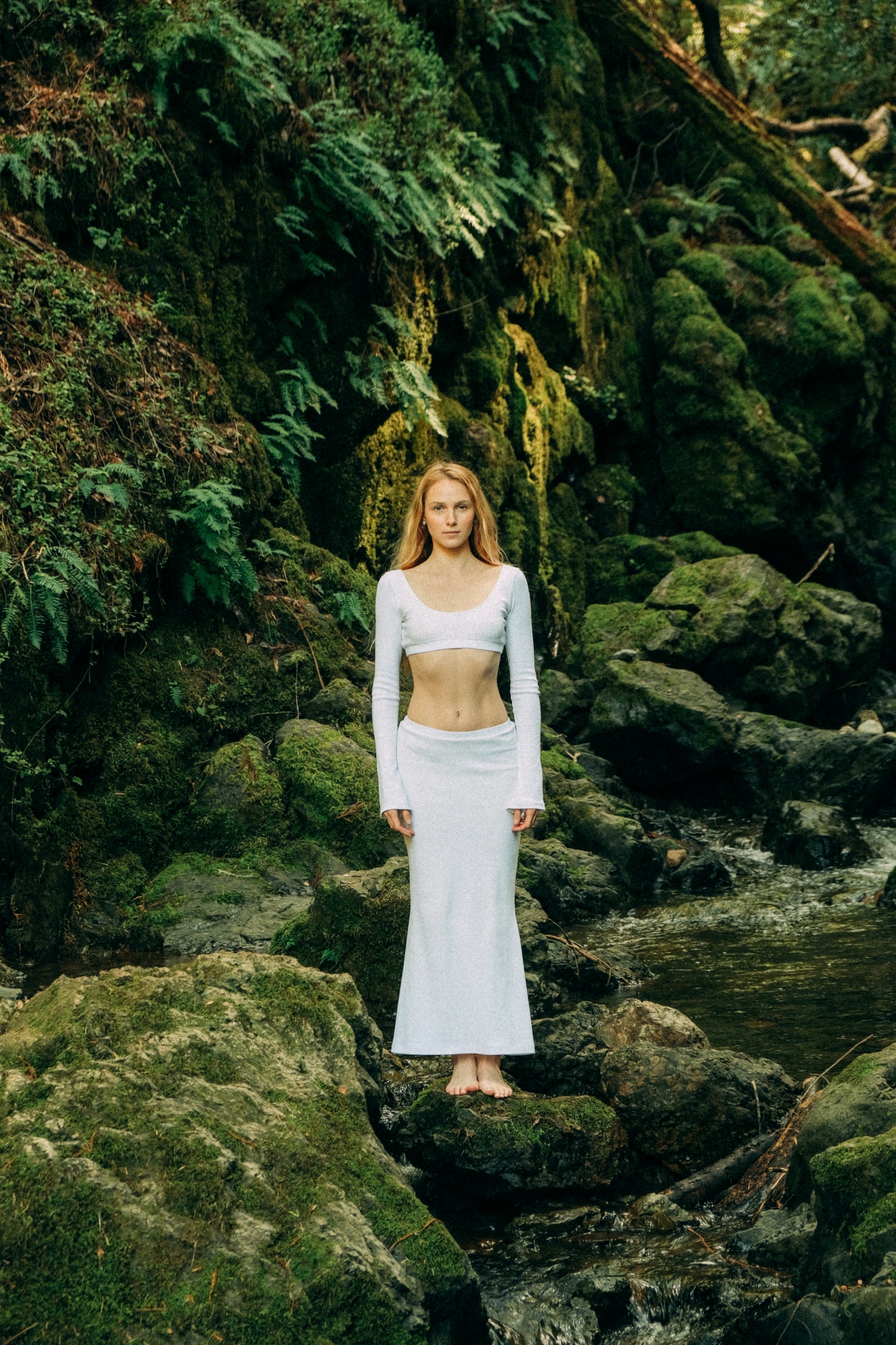 A maxi-length skirt defined by a slim silhouette that opens into a soft flare at the hem. A foundational piece that moves fluidly from casual wear to statement dressing.