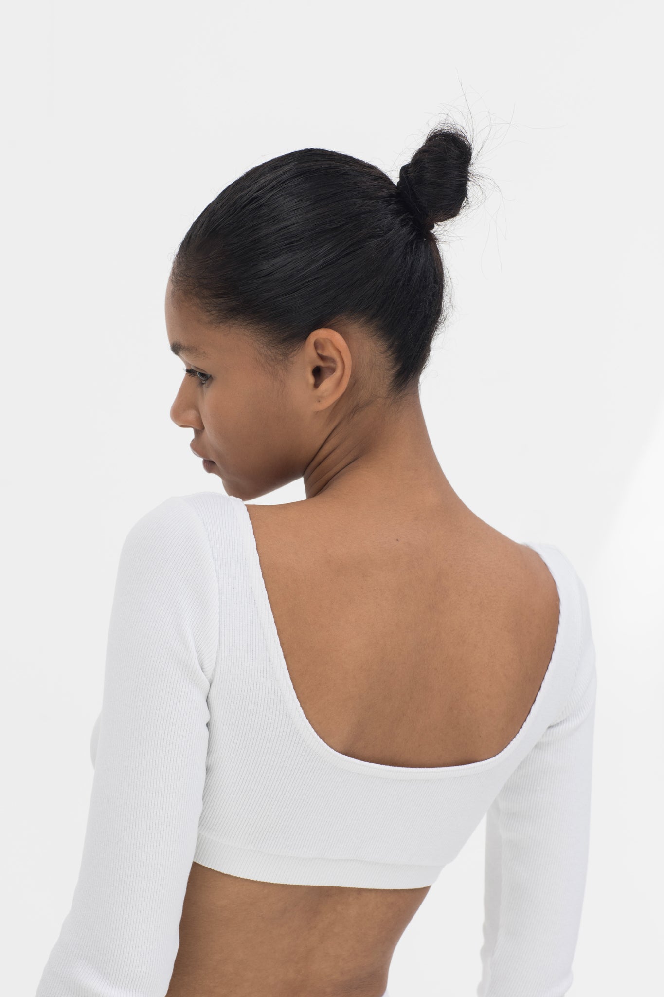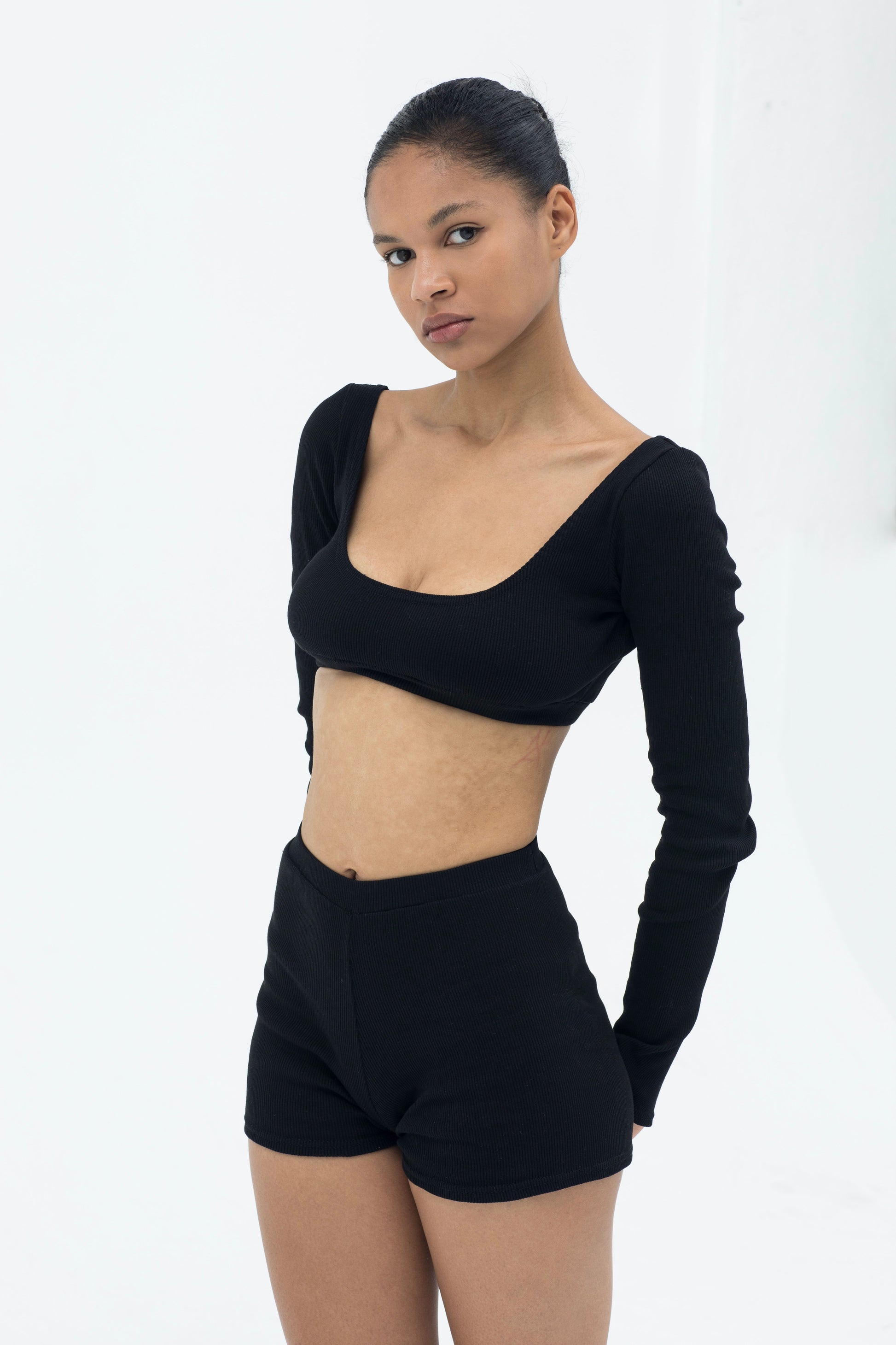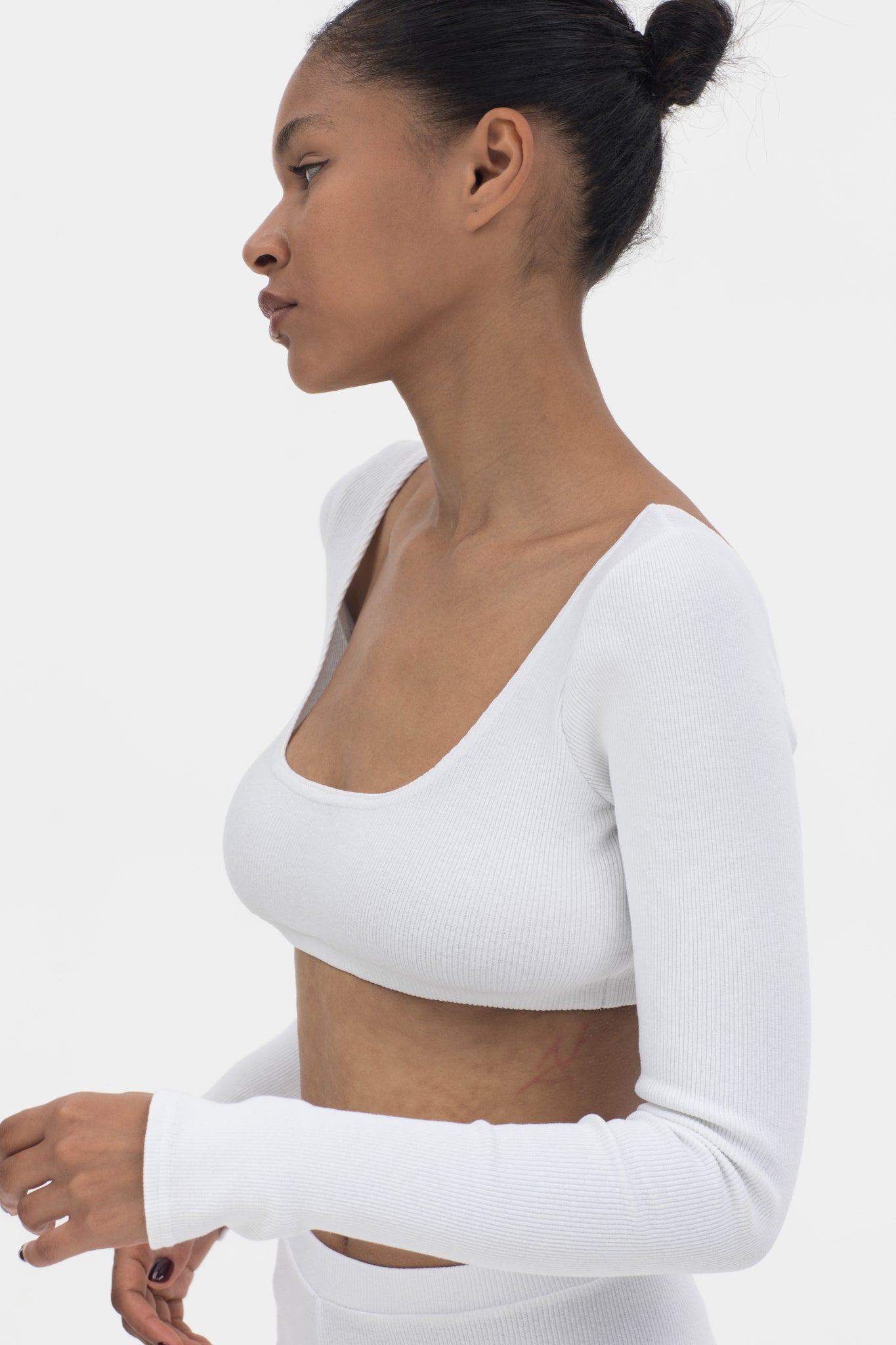An evolution of the Everyday Top, finished with elongated sleeves and subtle flared cuffs. Its reversible neckline and sculpted cropped fit create a refined balance between simplicity and quiet drama.