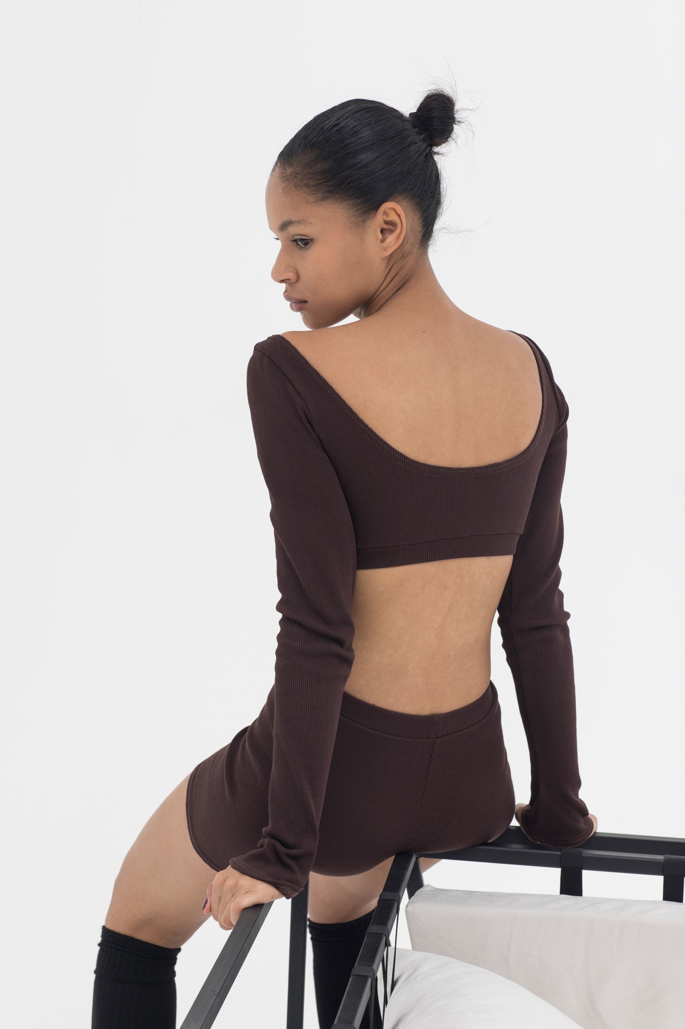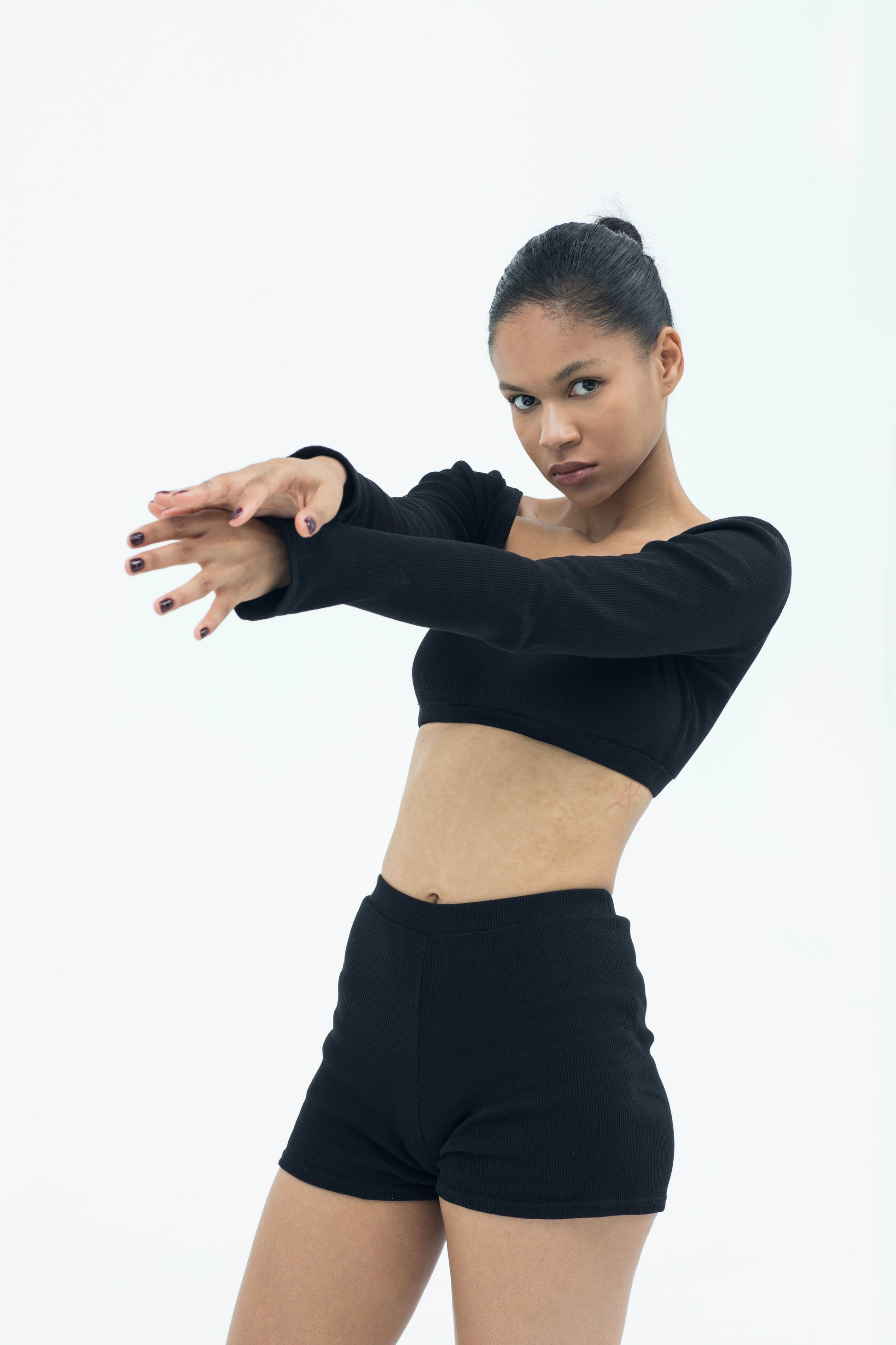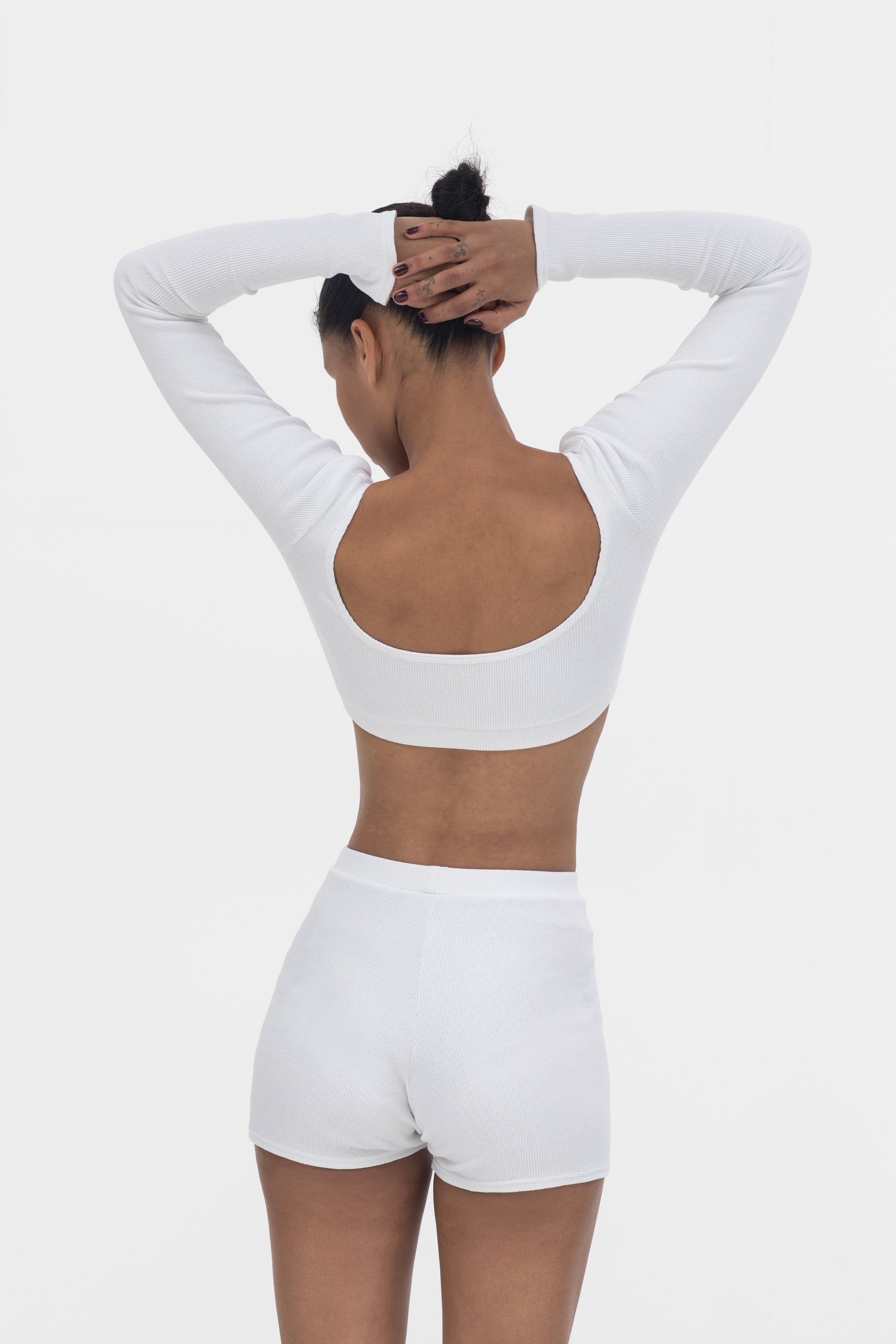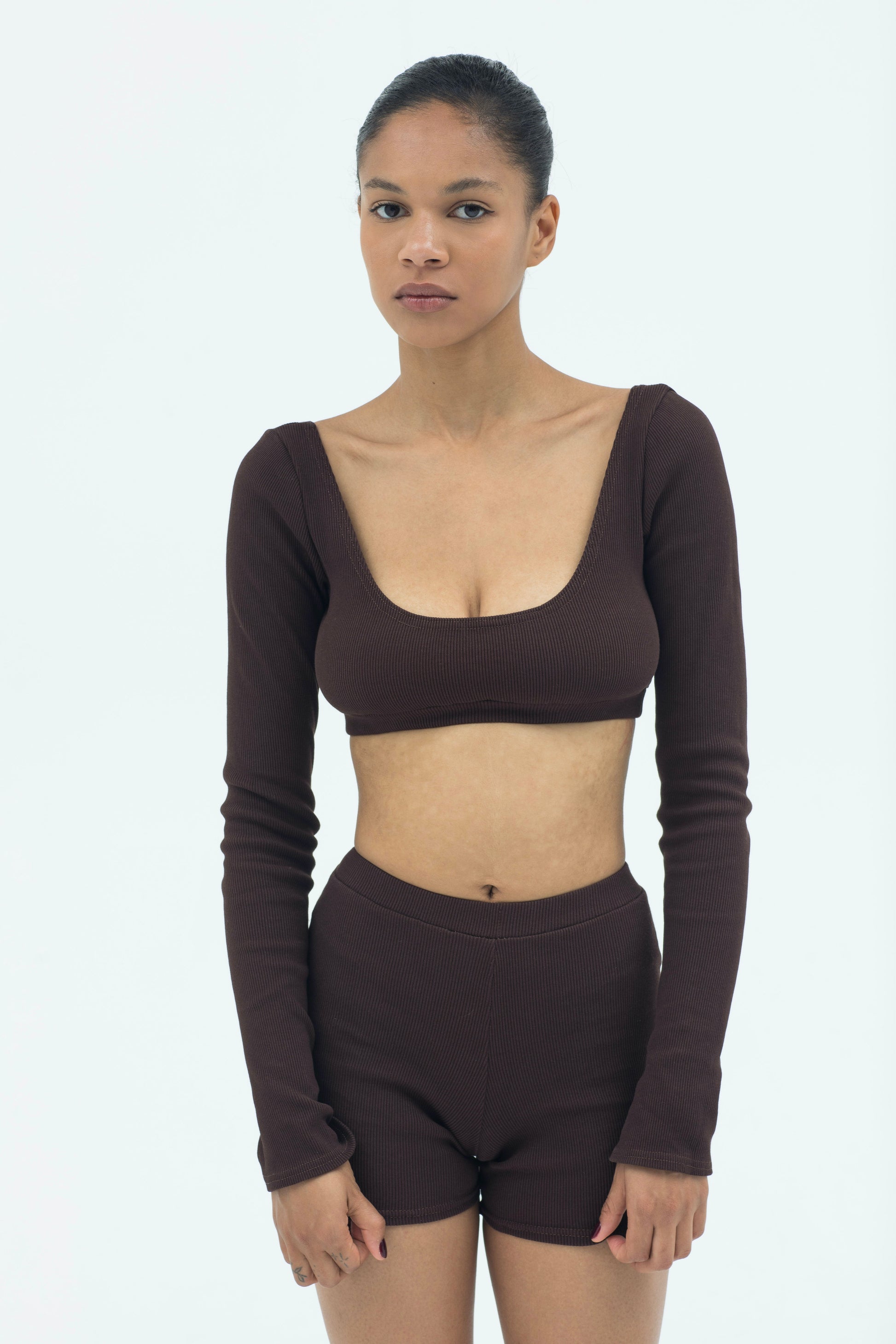 An evolution of the Everyday Top, finished with elongated sleeves and subtle flared cuffs. Its reversible neckline and sculpted cropped fit create a refined balance between simplicity and quiet drama.